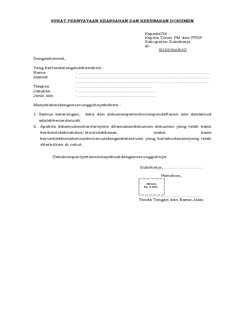 Contoh format surat pernyataan keabsahan dan keben. Surat permohonan surat permohonan yang didalamnya terdapat pernyataan kebenaran dan keabsahan dokumen & data… Surat pernyataan keabsahan dan kebenaran dokumen yang bertanda tangan dibawah ini : Contoh kop surat ini sama halnay dengan instansi lainnya. Surat kuasa pengurusan dokumen bermeterai cukup (jika bukan.
